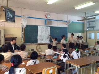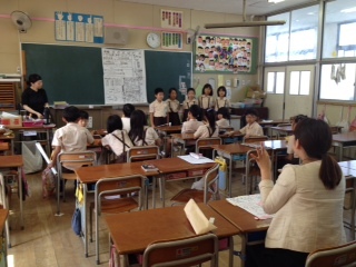 夏休みは各家庭で「エコ日記」を書いてきて、2学期にはグループで「エコ新聞」にまとめました。今日はその中間発表会で、各グループが自分たちの作った新聞の拡大コピーを示しながら説明しました。今日も来ていただいていたゲストティーチャーからは、各グループの新聞や発表の良いところをほめていただくと同時に、今後の取り組みに向けての課題もお話してくださいました。