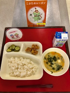 本日の献立は、「豚肉の香味あげ・みそ汁・きゅうりの甘酢づけ・ごはん・牛乳」でした。