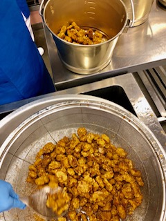 下段の写真は、豚肉の香味あげを配缶しているところです。