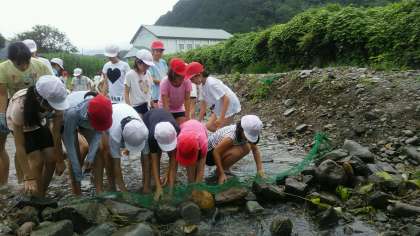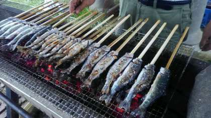 魚つかみの様子です。やはり小雨模様でしたが、みんな一生懸命にニジマスを追って、捕まえていました。宿舎の方が炭火で焼いてくださったニジマスをいただきました。とても美味しいかったです。