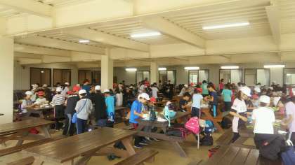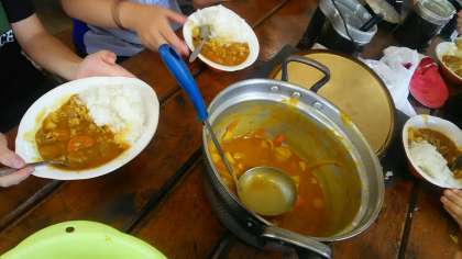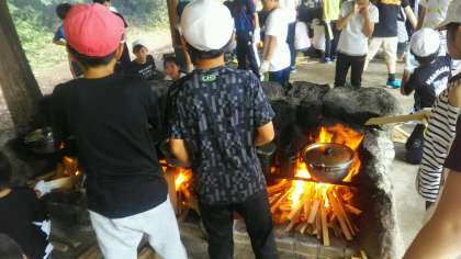 飯ごう炊飯の様子です。活動班で役割分担してカレーライスを作りました。「じゃがいもがかたいです〜。」という班もありましたが、「おいしい、おいしい。」と、鍋を空っぽにしていました。