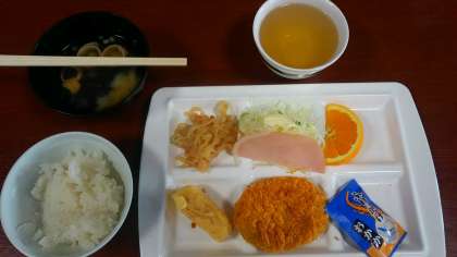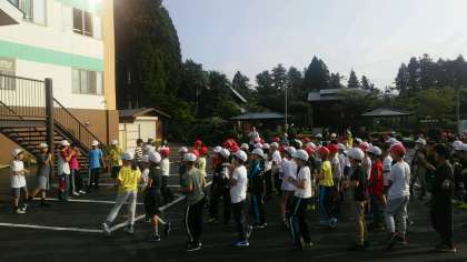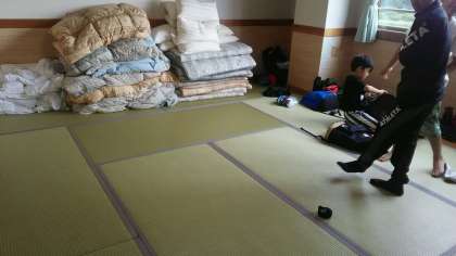晴れました!宿舎の前で朝の会をして、朝食をいただきました。食後、部屋の掃除と荷物整理をして、予定通り八反の滝に向かいます。