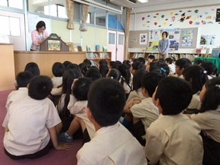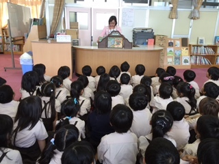 初日の今日は教職員との顔合わせと、本校の学校図書館の図書の整理をした後、さっそく2年生の子どもたちに紙芝居をしてくださいました。
