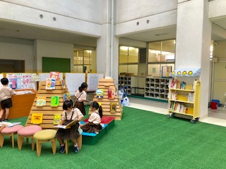 移動式給食図書コーナーは、1階のグリーンマットへ設置しました。