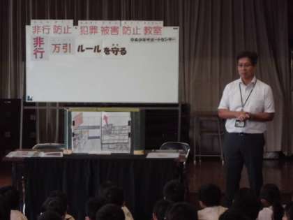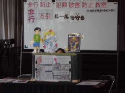 8月27日(火)。大阪府中央少年サポートセンターから講師の方が来てくださり、非行防止・犯罪被害防止教室(5年)を行いました。「非行とはどんな行いか。」、「万引きしたらどうなるか。」、「犯罪被害(声かけ被害)に合わないための防止方策」等についてペープサート(人形劇)を交えて教えていただきました。