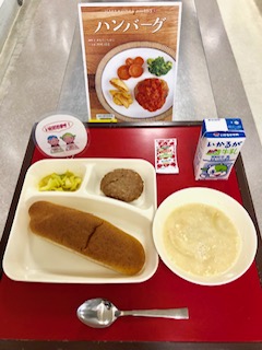 本日の給食を食べた児童の感想は、「焼きハンバーグはやわらかくて美味しかった。」「豆乳スープは、豆乳の味がしていて美味しかった。」等がありました。