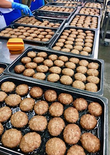 下段の写真は、焼きあがったハンバーグを配缶しているところです。