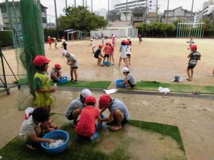 8月29日(木)。今日は予定どおりプールができました。1年生はプールの前に生活科で「なつだあそぼう」の学習をしました。運動場で砂遊びと水遊びを思いっきりやりました。ペットボトルで水のかけあいをして大はしゃぎでした。