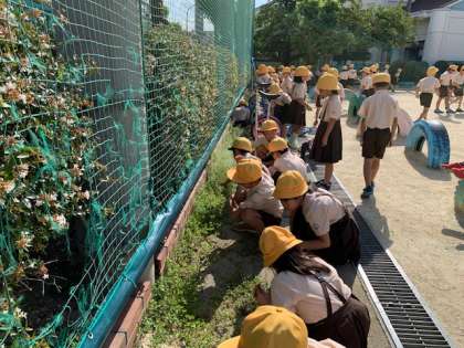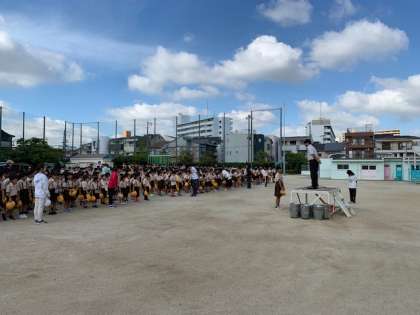 続けて「学校を美しくする日」を実施しました。各学年ごとに分担の場所で石拾いをしたり、草引きをしたりしました。みんなで力を合わせたので、学校がとてもすっきりしました。
