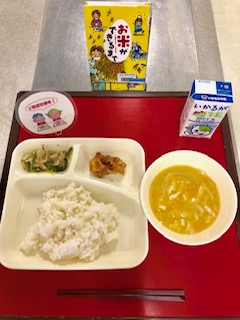 上段の写真は、本日の給食と給食図書です。本日の給食図書は、「お米ができるまで」でした。新潟県魚沼市の米作りにはげむ、ある農家のお話でした。本校(米飯を委託している学校)のお米は、青森県産の「つがるロマン」という銘柄を使用しています。(米飯を自校で炊飯している学校は北海道産の「おぼろつき」という銘柄です。)