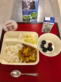 本日の献立は、「チキンカレーライス〔米粉〕・キャベツのピクルス・ぶどう(巨峰)・牛乳」でした。