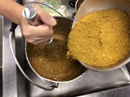 中段の写真は、米粉のルウをお湯で溶いているところです。