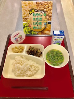上段の写真は、本日の給食と給食図書です。本日の給食図書は、「もやし・えだ豆・いり豆・きなこ」でした。「これも大豆だったのか」と気づくことが出来る図鑑でした。