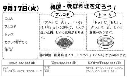 中段の写真は、本日の給食カレンダーです。プルコギとトックは、韓国・朝鮮料理です。プルコギの「プル」は「火」、コギは「肉」、トックの「トッ」は「もち」、「クッ」は「汁」という意味があります。