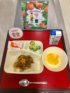 大豆入りキーマカレーライスは、ひき肉、にんじん、たまねぎ等が入った児童に人気のカレーでした。米粉で作られたルウを使用し、小麦アレルギーの児童でも食べられるように配慮されていました。また、ルウの中には、星型のラッキーにんじんが各クラスにひとつずつ入っていました。