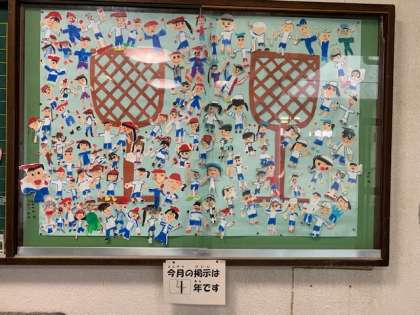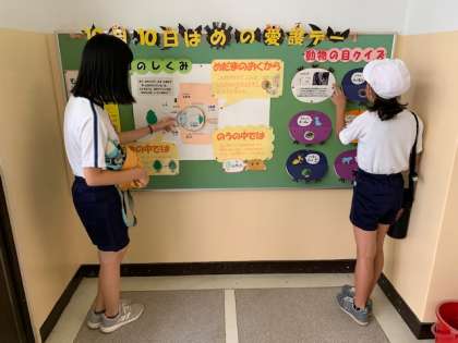 学年掲示板には、1年生が玉入れをテーマにかわいい作品を作ってくれました。保健室前には10月10日の「目の愛護デー」にちなんだ掲示物が貼られています。