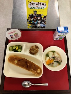 上段の写真は、本日の給食と給食図書です。本日の給食図書は、「こわいオオカミのはなしをしよう」でした。お父さんが息子のマイケルを寝かしつけるために、ベッドの横で自分で作った物語のお話をするのですが、マイケルのリクエストで「こわいオオカミ」が登場することになりました。さて、マイケルは素直に眠ることができたのでしょうか。気になる方は是非、読んでみてください。