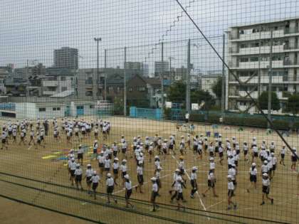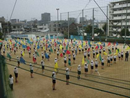運動会の練習が始まっています。写真は6年生の団体演技の練習風景です。