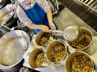 下段の写真は、、牛肉のきんぴらちらしを配缶している様子です。