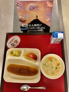 上段の写真は、本日の給食と給食図書です。本日の給食図書は、「もしも地球がひとつのリンゴだったら」でした。地球をひとつのリンゴに例えたり、生命誕生の歴史を1時間に縮めたりして、ものごとをわかりやすい例えで表している絵本でした。