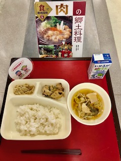上段の写真は、本日の給食と給食図書です。本日の給食図書は、「肉の郷土料理でした。北海道のジンギスカンや沖縄のソーキ汁等、全国の肉料理が載っている図書でした。