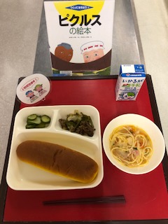 上段の写真は、本日の給食と給食図書です。本日の給食図書は、「ピクルスの絵本」でした。英語で漬け物のことをピクルスといいます。きゅうりのピクルスや、キャベツを乳酸発酵させた漬け物、ザワークラウト等の起源や作り方が載っている絵本でした。