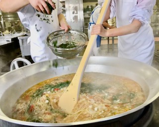 下段の写真は、スープスパゲッティにパセリを加えて仕上げているところです。