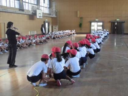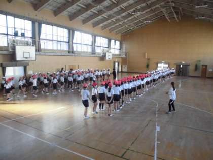 写真は、4年生の運動会練習風景です。講堂で綱引きの隊形を練習しました。