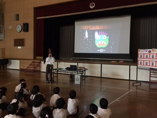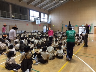 10月21日(火)ハロウィンを前に、2,3,4年生がハロウィン・パーティーをしました。C-NETのEddy先生とあいさつをした後、ハロウィンのいろいろなキャラクターの英語の言い方を教えてもらい、それを使って「ハロウィンじゃんけん」や「ハロウィン・リレー」のゲームを楽しみました。