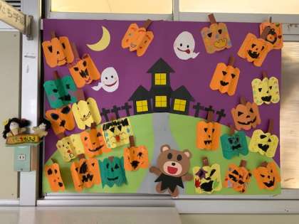 10月31日(木)10月も最後の日となり、朝夕の気温が低くなってきました。今日は世間ではハロウィンの日です。グリーンマットには、外国の文化を理解する目的で、ハロウィンの由来やキャラクターが掲示してあります。ともだち学級の前には、子どもたちの作ったかわいいジャックオランタンが飾られています。