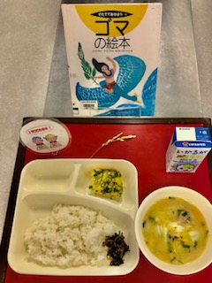 上段の写真は、本日の給食と給食図書です。本日の給食図書は、「ゴマの絵本」でした。ごまの歴史や栄養、品種の紹介等が載っている絵本でした。