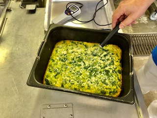 下段の写真は、焼き上がった千草焼きの中心温度を測定しているところです。85度以上上がっているかを確認しています。