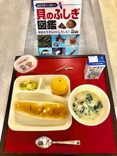 上段の写真は、本日の給食と給食図書です。本日の給食図書は、「貝のふしぎ図鑑」でした。日本近海だけでも5,000種類も生息している貝の生態がわかる図鑑でした。
