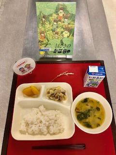 本日の献立は、「豚肉とまいたけのいためもの・つみれ汁・かぼちゃういろう・ごはん・牛乳」でした。