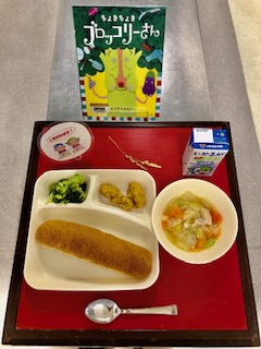 上段の写真は、本日の給食と給食図書です。本日の給食図書は、「ちょきちょきブロッコリーさん」でした。床屋さんを営む腕利きのブロッコリーさんに、ナスさんやトウモロコシさんやダイコンさんが髪を切ってもらう絵本でした。さて、それぞれの野菜さんたちはどんな髪型になったでしょうか。気になる方は、是非読んでください。