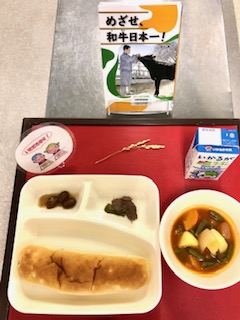 左側の写真は、本日の給食と給食図書です。本日の給食図書は、「めざせ、和牛日本一!」でした。和牛の日本一を決める大会に、高校生が挑む物語でした。