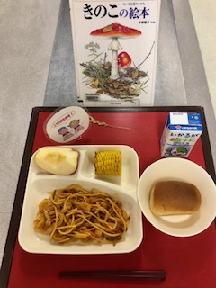 上段の写真は、本日の給食と給食図書です。本日の給食図書は、「きのこの絵本」でした。野生のきのこに魅せられた画家が贈る、きのこの魅力がいっぱいつまった絵本でした。
