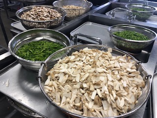 下段の写真は、スパゲッティの具材です。カットされたエリンギやしめじ、ピーマン等が写っています。