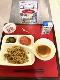 12月3日(火)の献立は、「黒糖パン(小)・オイスターソース焼きそば・きゅうりの中華あえ・りんご・牛乳」でした。