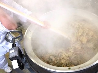 下段の写真は、焼きそばを仕上げているところです。炒めた具と茹でたての麺が合わさり、蒸気がもくもく出ています。