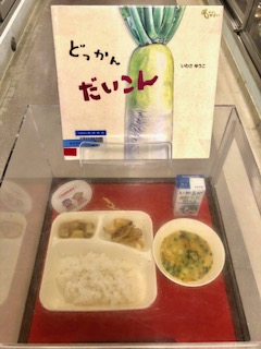 上段の写真は、本日の給食と給食図書です。本日の給食図書は、「どっかん だいこん」でした。あおくび大根や、みうら大根、ねりま大根等いろいろな大根が説明付きで分かりやすく描かれている絵本でした。