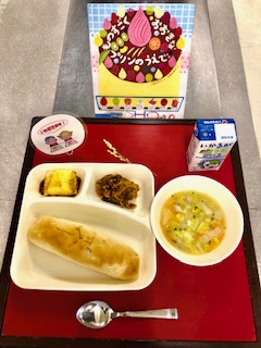 12月5日(木)の献立は、「おさつパン・豚肉のケチャップソテー・コーンスープ・焼きプリン・牛乳」でした。