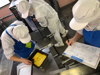 下段の写真は、焼き上がったプリンの中心温度を計っているところです。