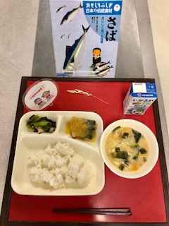上段の写真は、本日の給食と給食図書です。本日の給食図書は、「おもしろふしぎ日本の伝統食材 さば」でした。古来から日本全国で食べられてきたさば。しめさばや柿の葉寿司等、各地のさばの伝統料理が載っている絵本でした。