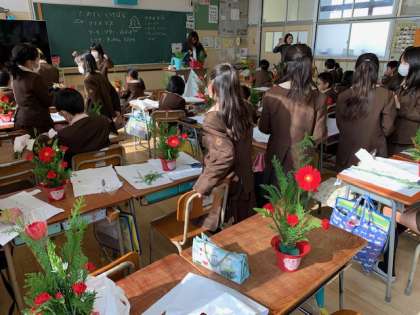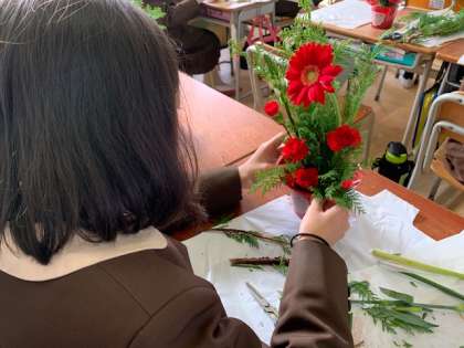 4年生は「生け花体験」をしました。ガーベラ、カーネーション、オーニソグラム、ヒバを使って、クリスマスに因んだ生け花に取り組みました。茎をハサミで切るやり方や、花とお話するように向きを決めることを教えてもらいながら、一人一人が個性的な生け花作品を作りました。