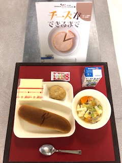 上段の写真は、本日の給食と給食図書です。本日の給食図書は、「チーズができるまで」でした。牧場の片隅にあるチーズ工場で、牛乳からチーズが作られる様子が載っている写真絵本でした。