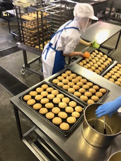 下段の写真は、焼きあがったとうふハンバーグを台に並べているところです。ここからクラスごとに食缶へ入れていきます。