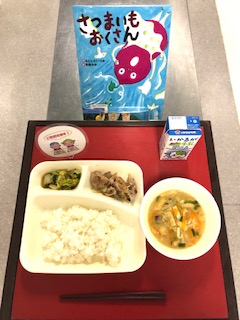 上段の写真は、本日の給食と給食図書です。本日の給食図書は、「さつまいもおくさん」でした。子どもたちが「さつまいもおくさーん」と呼びながら芋掘りをすると、さつまいもの姿をした「さつまいもおくさん」が出てくる、愉快な絵本でした。
