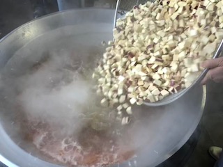 下段の写真は、みそ汁を作っている釜にさつまいもを加えているところです。この後、だしで溶いたみそを加えて仕上げます。