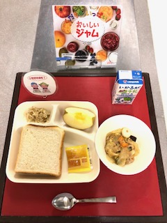 上段の写真は、本日の給食と給食図書です。本日の給食図書は、「くだものいっぱい!おいしいジャム」でした。いちごジャムやりんごジャム、マーマレード等の作り方が載っている図書でした。本日のアプリコットジャムの「アプリコット」とは「あんず」のことです。